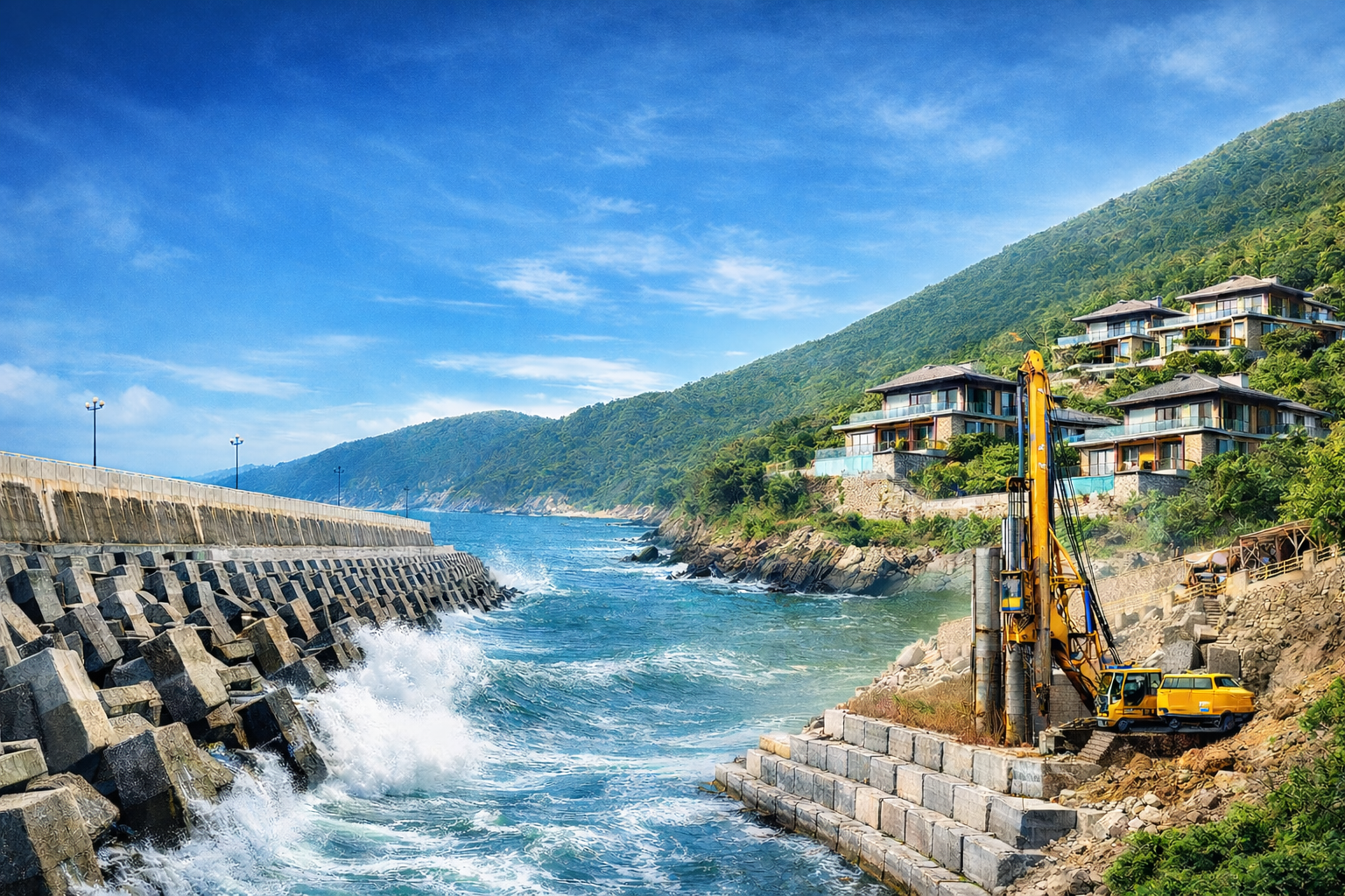 Kỹ thuật kè chắn sóng và công nghệ xây dựng của Vingroup tại địa hình đồi núi ven biển