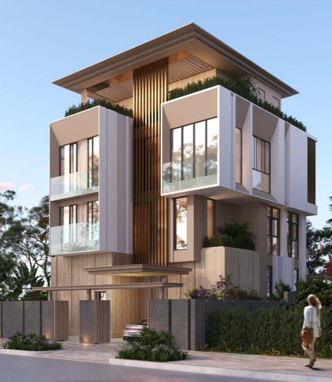 Mẫu nhà Liền Kề lấy cảm hứng từ kiến trúc resort nhiệt đới, với các mảng vật liệu tự nhiên và thiết kế thông thoáng.