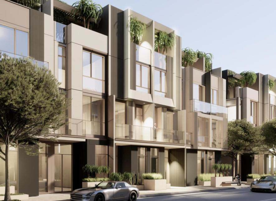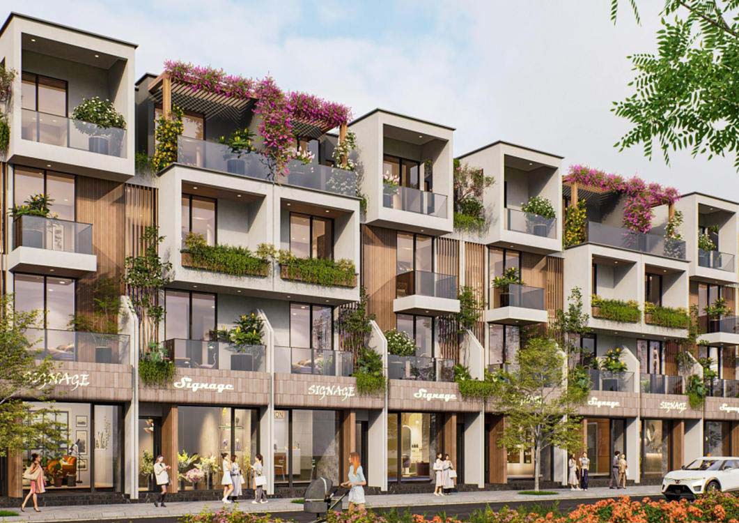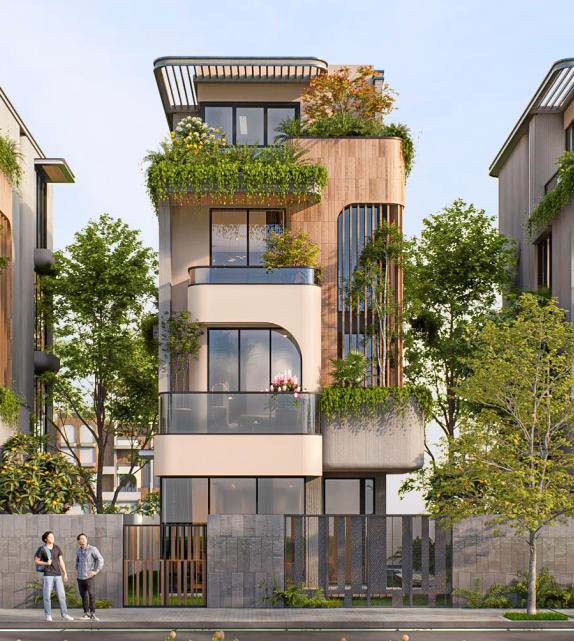 Nhà liền kề được thiết kế theo phong cách hiện đại với nhiều mảng xanh trên ban công và mặt đứng công trình.